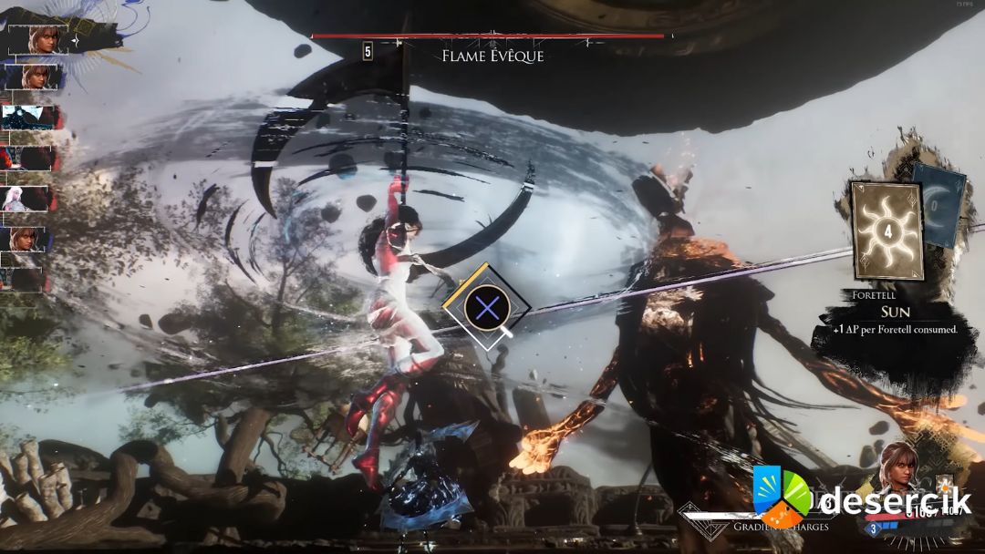 Zaletą tego buildu jest to, że możesz zacząć go używać od razu po zdobyciu Chation – broni, która sprawia, że wszystkie Umiejętności Słońca Sciel nakładają 10 efektów Przepowiedni (Foretell) na wrogów. To potężne, ale ryzykowne, bo Sciel otrzymuje wtedy podwójne obrażenia.