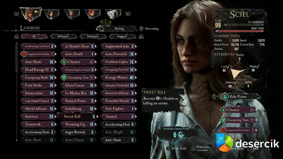 Breaker i Kontratak Łamiący są świetne na wrogów z tarczami, podczas gdy reszta Luminas poprawia ekonomię AP Sciel. Alternatywnie, możesz zdobyć Pictos Ostatniego Bastionu (Last Stand Pictos) w ukrytej Arenie Gestral, by zrobić z niej solowego tanka.