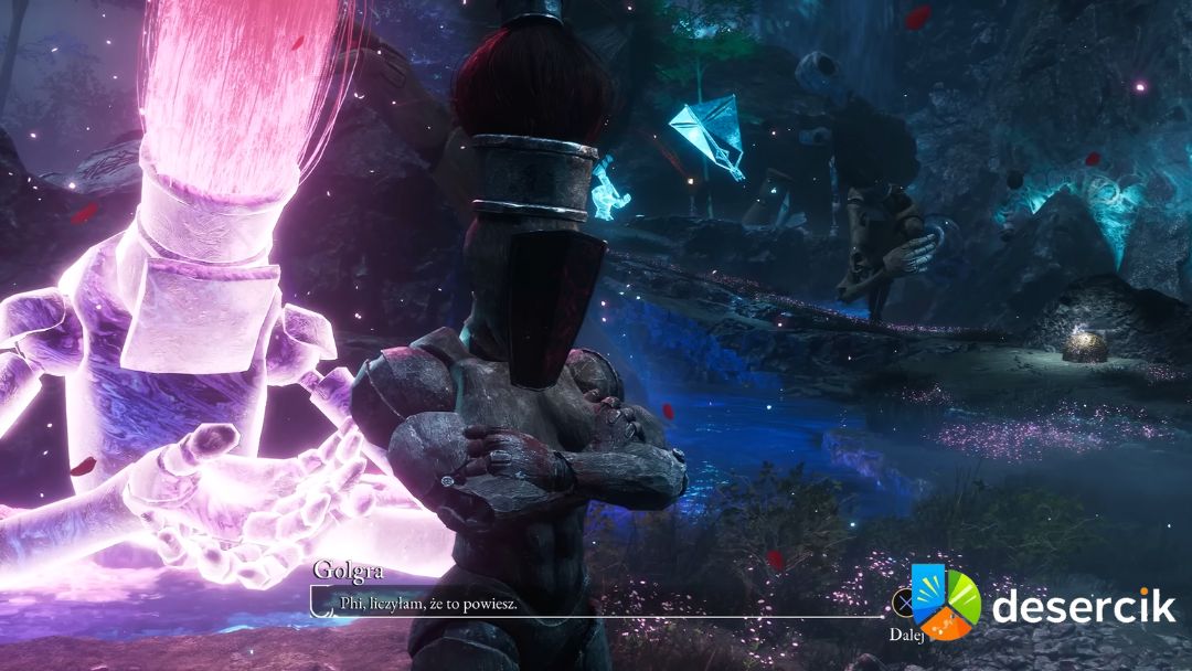 Po dotarciu do Świętej Rzeki, zbliż się do ogromnego ducha o różowo-fioletowej barwie, który znajduje się niemal na końcu lokacji, przy przepaści. To właśnie ten duch będzie Twoim przewodnikiem w tej misji. Przygotuj się na wyzwanie, ponieważ duch ten nie będzie łatwy do pokonania.