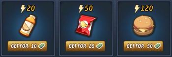 - Bonus dzienny: Gracz może otrzymać energię, obracając kołem Daily BonusKup przedmioty energetyczne: Gracz może również kupować przedmioty energetyczne za gotówkę, aby od razu uzyskać energię. (Butelka soku pomarańczowego kosztuje 10 gotówki i daje 20 punktów energii, worek chipsów ziemniaczanych kosztuje 25 gotówki i daje 50 punktów energii, a burger kosztuje 50 gotówki i daje 120 punktów energii.)