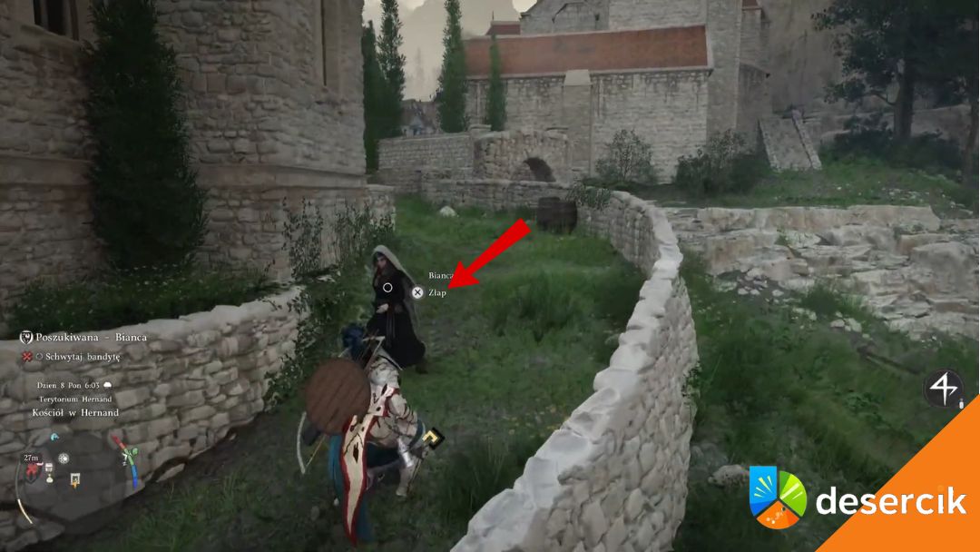 Po zdobyciu listu gończego na mapie pojawi się przybliżona lokalizacja Bianki na wschodnim krańcu miasta. Wchodząc w obszar misji, zwracaj uwagę na białą ikonę kartki na minimapie – to dokładne miejsce, gdzie aktualnie przebywa. Porusza się po całym kościele, czasem wychodzi poza wyznaczony krąg. Najczęściej pojawia się w następujących miejscach: