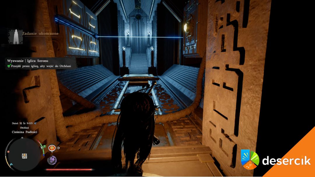 Gdy wejdziemy do Cieśniny Podłości, po lewej stronie natrafimy na pierwszy laser. To on będzie naszym punktem wyjścia. Z pomocą Mocy Aksjomatu możemy przesuwać ten laser dokładnie tam, gdzie jest potrzebny – w tym przypadku w środek pomieszczenia, aby trafił w żółty kryształ po prawej stronie. Po poprawnym ustawieniu podłoga częściowo się otworzy, pozwalając zejść niżej do głównej strefy zagadki.