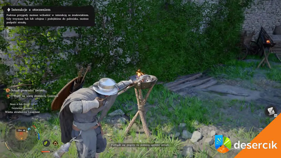 Najpierw naciągnij łuk, a następnie zbliż grot strzały do płomienia pochodni, aby go podpalić. Gdy końcówka zacznie się palić, wystrzel strzałę w krzaki – spłoną i odsłonią wejście.