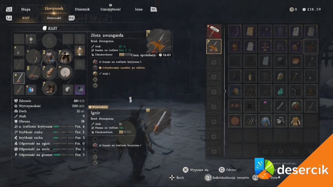 Nagroda jest całkiem sensowna – dostajesz broń (lanca) Złota Awangarda oraz 1 Artefakt Otchłani, czyli coś, co realnie przydaje się później przy rozwijaniu postaci.