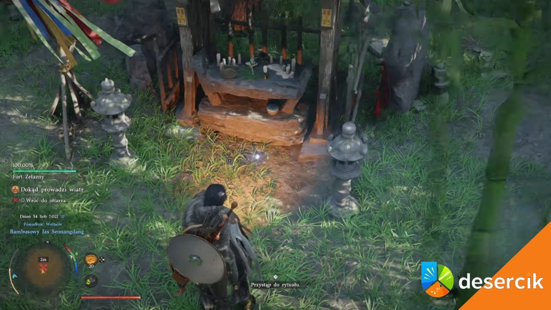 Wracasz do ołtarza w bambusowym lesie, który już wcześniej odwiedzałeś. Podchodzisz i patrzysz na ziemię przed nim – pojawi się opcja interakcji „Zbadaj”, którą uruchamiasz.
