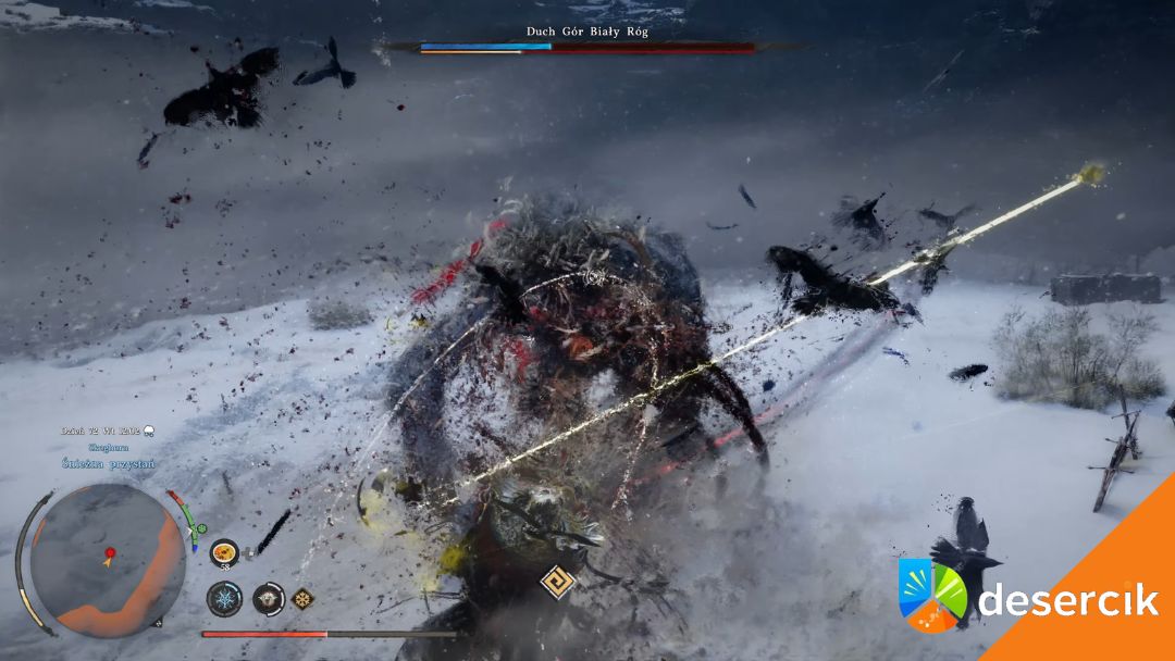 Boss zaczyna grać bardziej agresywnie. Pojawia się ryk, który na chwilę unieruchamia postać, a zaraz potem Biały Róg próbuje cię zgnieść lub przeciąć. Najważniejsze to szybko odzyskać kontrolę i unikać na boki, zamiast panikować.