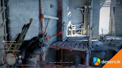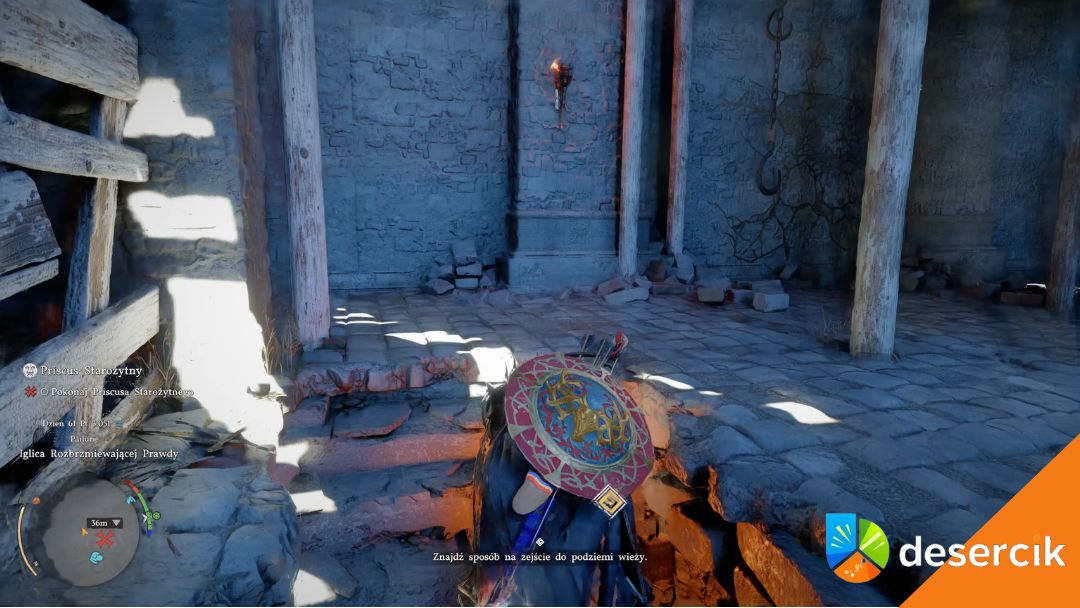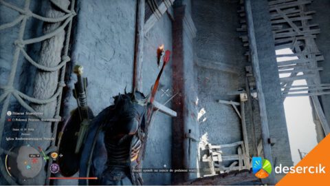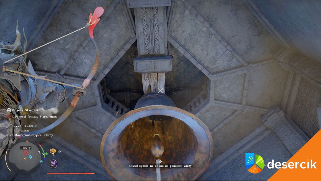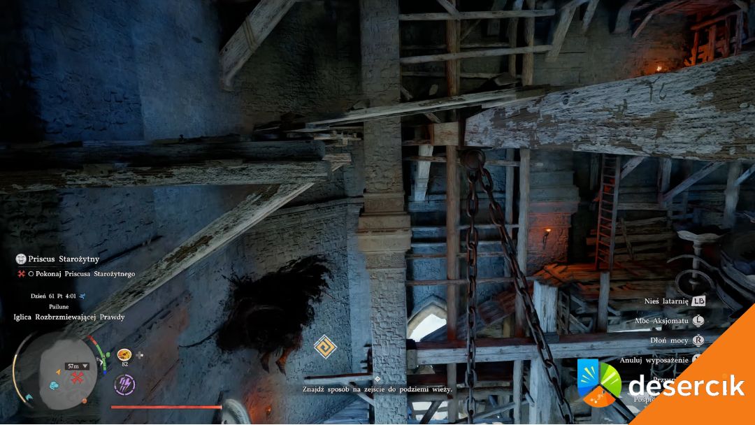 Na szczycie czeka najważniejszy element całej tej lokacji, czyli dzwon. I tutaj warto się na chwilę zatrzymać, jeśli nie wiesz co zrobić. Klucz tkwi w uszkodzonym kawałku drewna obok niego. Używasz na nim Mocy Aksjomatu i wtedy wszystko staje się jasne – konstrukcja puszcza, dzwon spada w dół, a razem z nim rozwala fragment podłogi. W ten sposób tworzy się przejście do podziemi, do których wcześniej nie było dostępu. Możesz także wykorzystać łuk i skupiony strzał.
