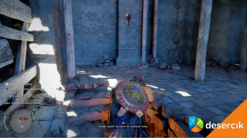 Idąc po schodach napotkasz przerwę w platformie, którą mógłbyś przeskoczyć, ale wystarczy wyjąć łuk i przeciąć linę strzałą, dzięki czemu opuszcza się podest, po którym możesz przejść.