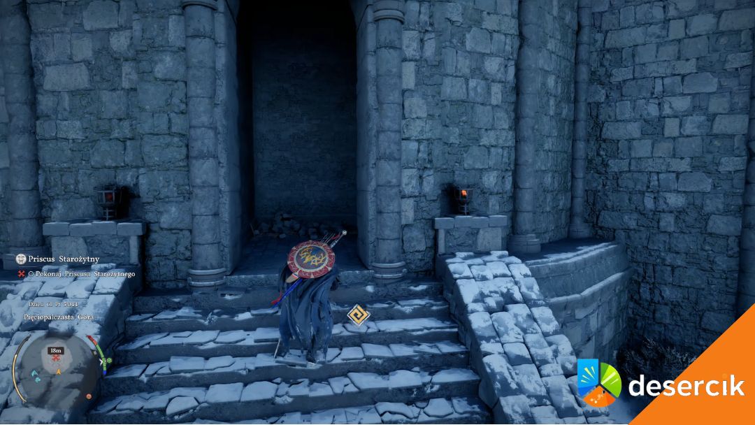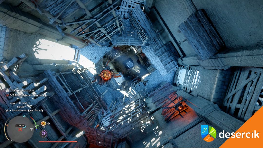 Gdy pojawi się otwór, nie pozostaje nic innego jak skoczyć w dół. Warto kontrolować spadanie, najlepiej używając szybowania, żeby nie stracić zdrowia. Po wylądowaniu kierujesz się na zachód, gdzie znajduje się pomieszczenie z niebieskim portalem. To właśnie tam czeka Priscus Starożytny.