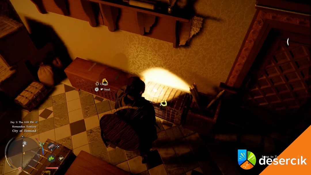 Warto wiedzieć, że naprzeciw bankiera zawsze znajduje się zamknięte pomieszczenie magazynowe, pełne sejfów na półkach i skrzyń na podłodze. Możesz je wszystkie okraść, ale pamiętaj – każda kradzież nieco obniża twoją rangę w Hernand lub w frakcji, od której kradniesz.