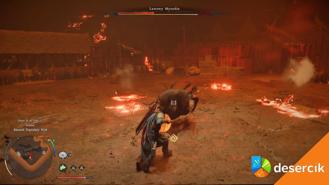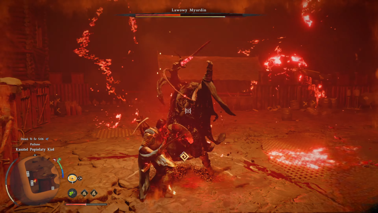 Druga faza, czyli Lawowy Myurdin, jest szybsza i bardziej agresywna. Nakłada też efekty ognia, które utrudniają walkę. Mechanika pozostaje podobna: wykorzystujesz Cięcie w szarży i Skupienie, żeby narzucić własne tempo walki.