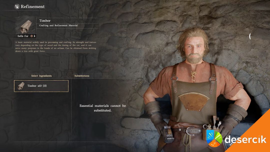 Po wybraniu przedmiotu przechodzisz do ekranu materiałów. Tutaj widać dokładnie, czego potrzebujesz, żeby wykonać ulepszenie. Czasami można zastąpić jeden materiał innym, ale nie dotyczy to materiałów niezbędnych (Essential Materials), takich jak drewno do drewnianych przedmiotów – te trzeba mieć dokładnie takie, jakie są wymagane.