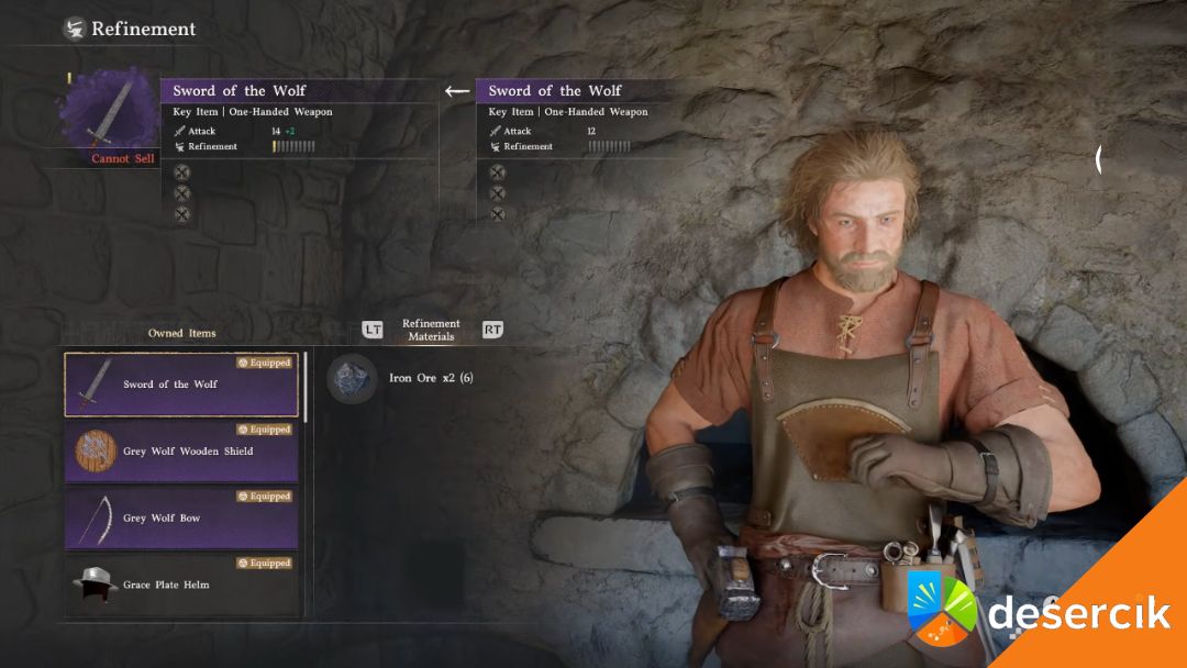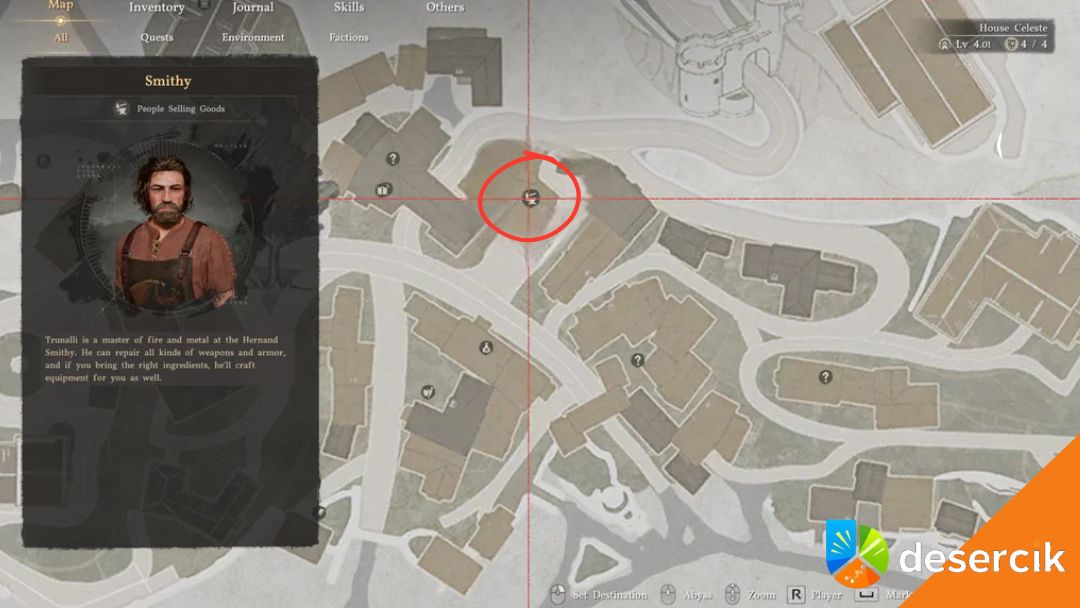 Do ulepszania potrzebujesz odwiedzić kuźnię (Smithy). Te miejsca znajdziesz w większych miastach i osadach – np. w Hernand. Na mapie kuźnię łatwo rozpoznać po ikonie kowadła. Po wejściu do środka najlepiej od razu podejść do kowala i porozmawiać z nim. Warto podejść do tego spokojnie, bo kowal wyjaśni ci wszystko krok po kroku.
