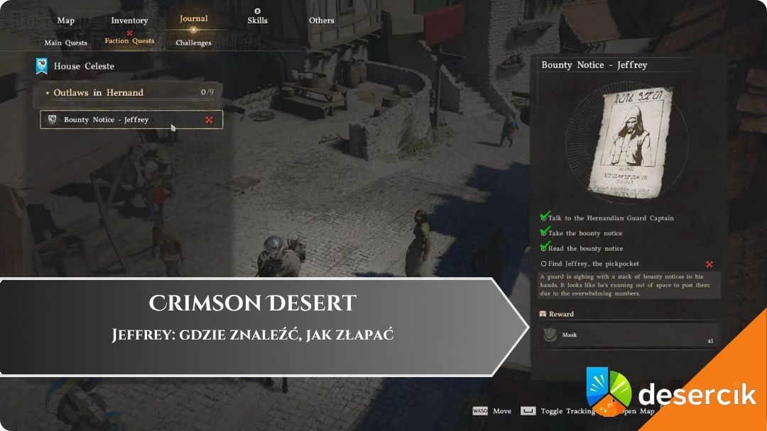 Jeffrey to w praktyce misja wprowadzająca do systemu listów gończych w Crimson Desert. Nagroda jest symboliczna, ale zlecenie pokazuje krok po kroku, jak działa tropienie, obezwładnianie i odstawianie przestępców. Łatwo je też przeoczyć, zwłaszcza jeśli pędzisz z fabułą lub od razu bierzesz trudniejsze kontrakty.