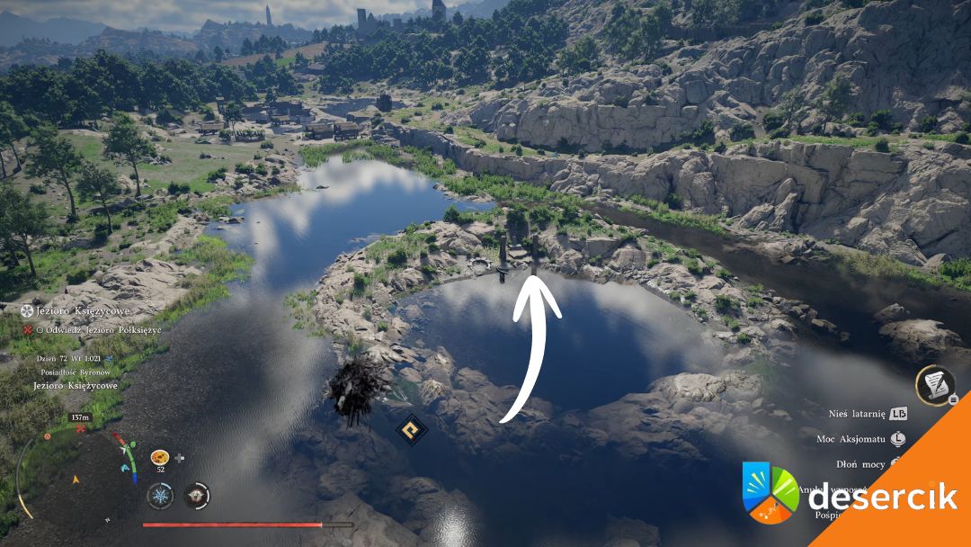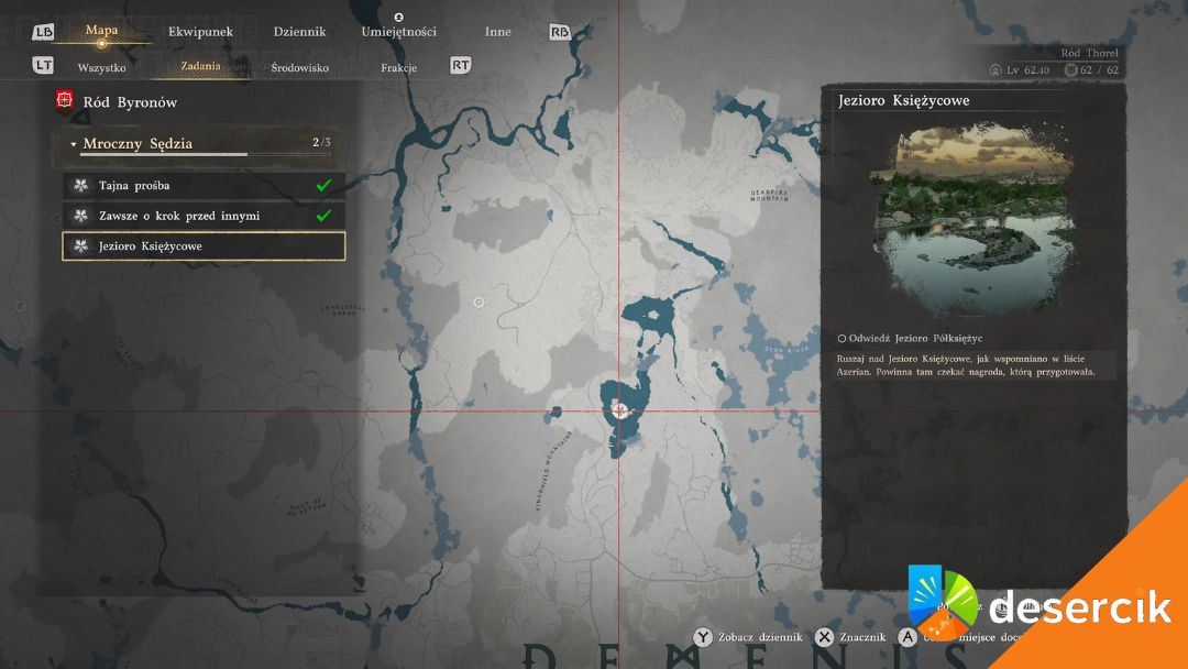 Otwierasz dziennik zadań, zaznaczasz kolejny etap i gra automatycznie prowadzi cię do Jeziora Księżycowego. Nie trzeba zgadywać ani przeszukiwać mapy. To klasyczny moment w tej grze – najpierw progres fabularny, potem dostęp do lokacji.