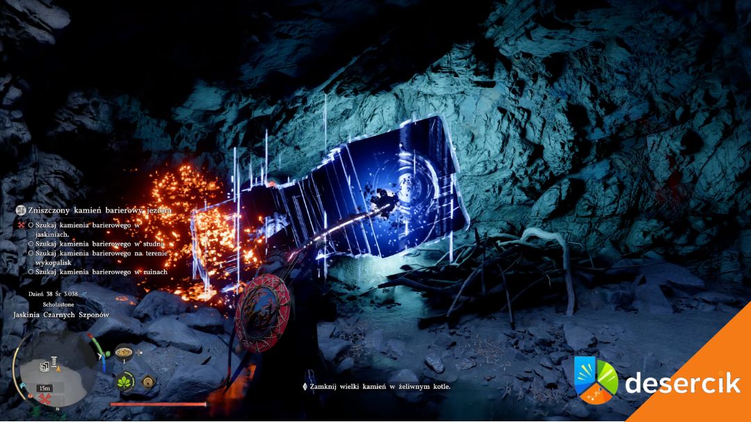 Wskakujesz do środka i używasz lotu, żeby bezpiecznie opaść na dół. Na dnie czeka pierwszy kamień. Podnosisz go przy użyciu Mocy Aksjomatu, a potem „zapieczętowujesz”, żeby trafił do Kotła Kuku.