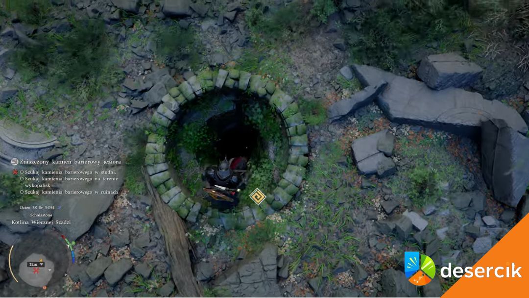 Na wschód od jeziora trafisz na starą, zarośniętą studnię. Wygląda niepozornie, ale to pierwszy trop.