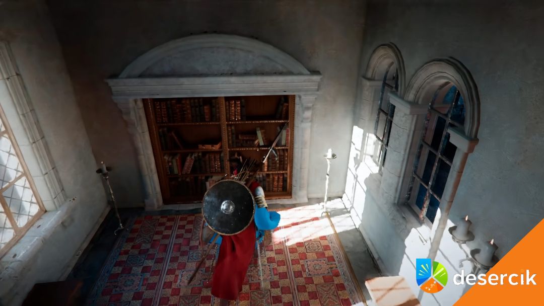 Wchodzisz do środka i szukasz regału w południowo-wschodnim rogu. To nie jest zwykła dekoracja – po interakcji przechodzisz przez niego do sekretnego pomieszczenia. Skrzynia stoi przy ścianie po lewej stronie.