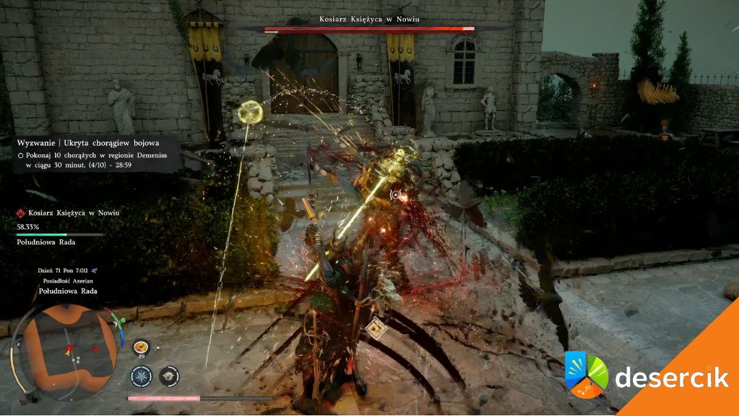 Kluczowy trik, który wielu graczy odkryło dopiero po kilku próbach, to wykorzystanie otoczenia. Możesz wejść przez podwójne drzwi do posiadłości, co zmusza bossa do obejścia budynku i daje ci kilka sekund spokoju. To jest moment, w którym gra nagle przestaje być chaosem, a zaczyna przypominać normalną walkę.