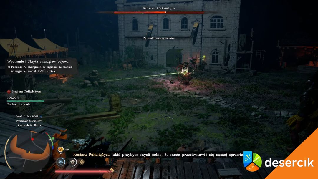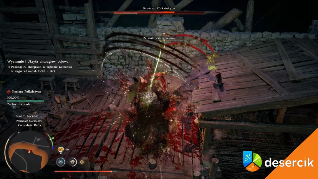 Kosiarz Półksiężyca to boss, który w dużej mierze opiera się na tempie walki i nieprzewidywalności. Łączy szybkie ataki wręcz z presją na dystansie, przez co praktycznie cały czas jesteś zmuszony reagować. Jego najgroźniejszym ruchem jest wirująca kombinacja kosą, która przy złym wyczuciu momentu potrafi natychmiast cię zachwiać i otworzyć na kolejne obrażenia.