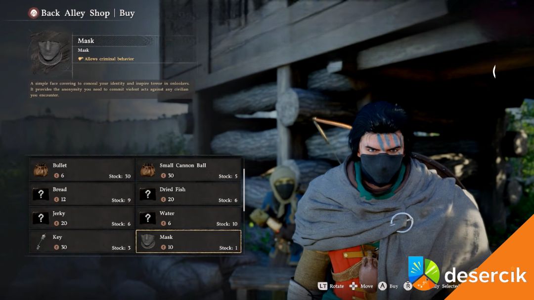 Maskę można zdobyć na kilka sposobów, np. jako łup po pokonaniu bandytów, ale najprostsza metoda to zakup w sklepie na zaułku koło Hernand. Tam Grimrak sprzedaje maskę za zaledwie 10 miedzi, więc nie nadwyręża portfela. Po założeniu maski możesz rozpocząć swoje „przygody” w świecie przestępczym.