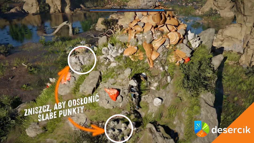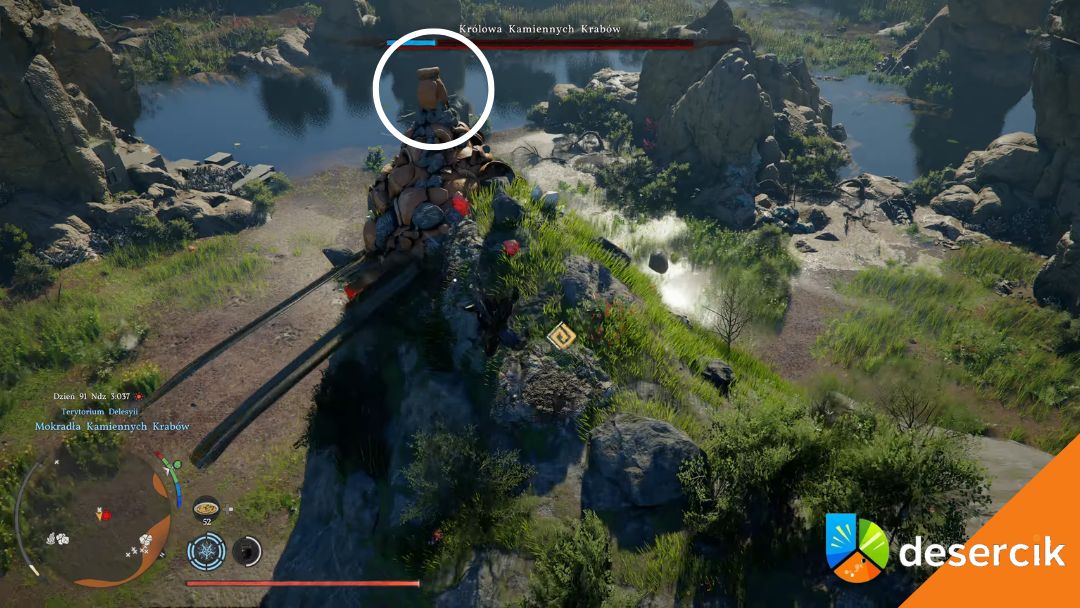 Gdy już go zauważycie, trzeba się przyklęknąć i wykonać cios w dół, albo po prostu trzymając się kraba, zaatakować normalnie. Następnie ponownie użyjcie przycisku ataku, aby wyciągnąć sztylet – to spowoduje zmniejszenie niebieskiego paska zdrowia Królowej Kamiennych Krabów.