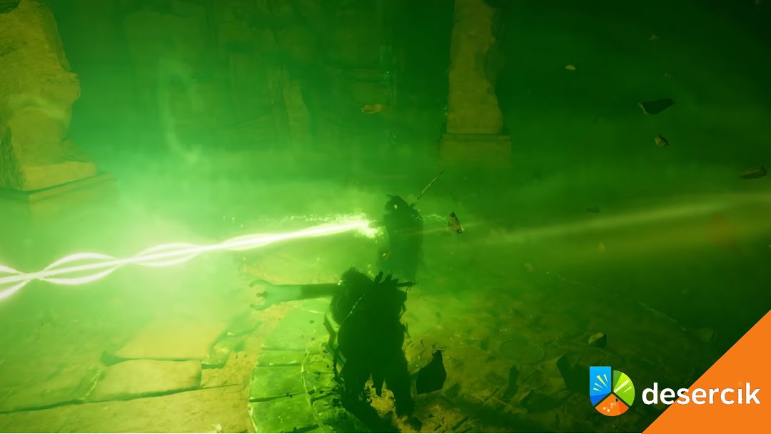 • Skacze po filarach i dashuje nad Tobą. Ignoruj jego pozycję i skup się na czerwonym błysku, który wskazuje moment uniku.