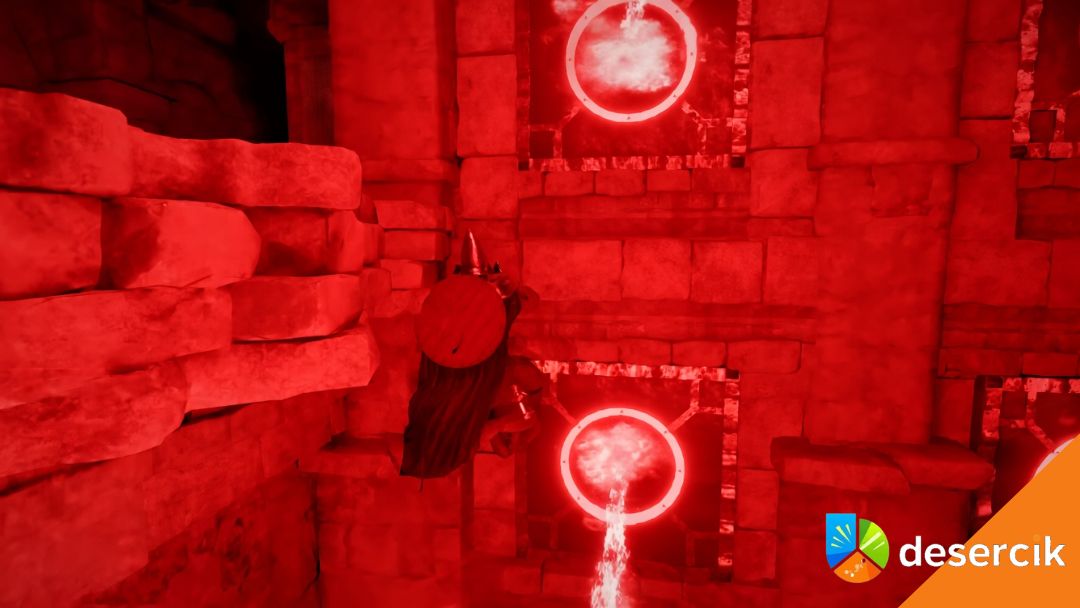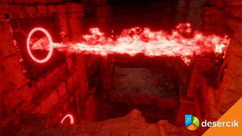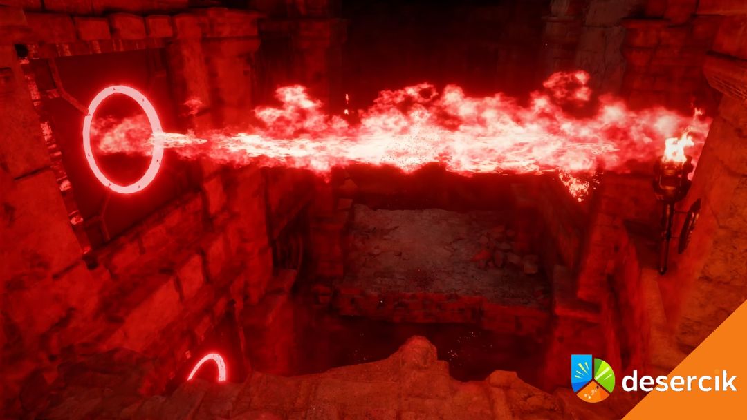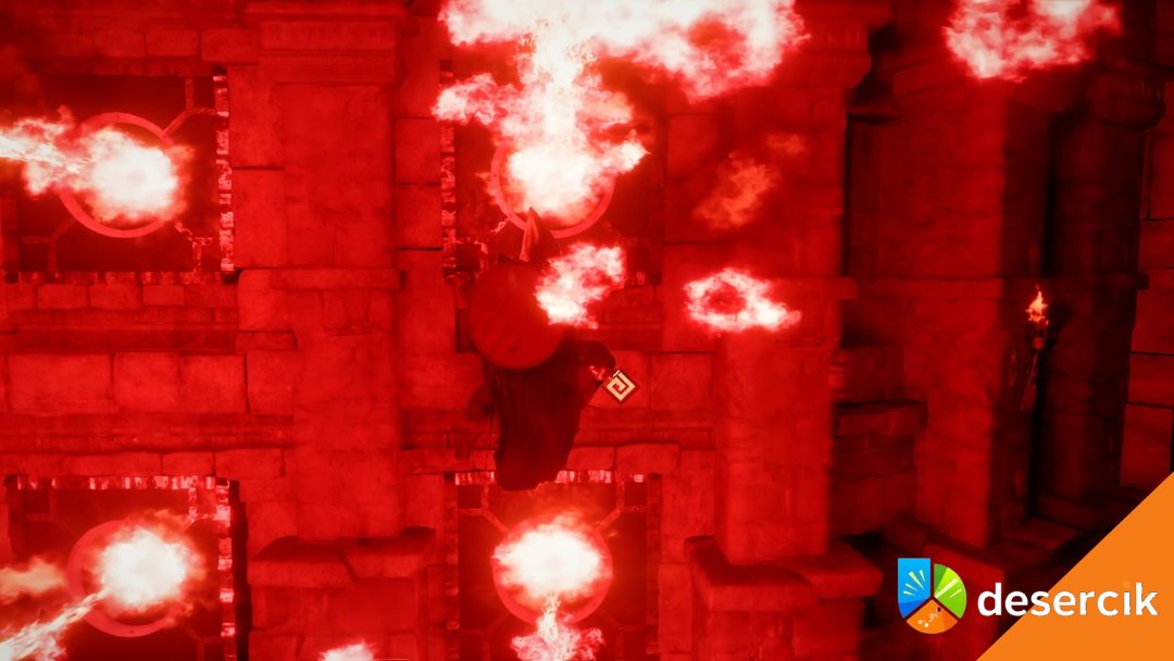 Po zejściu pod ziemię gra od razu daje ci znać, że to nie będzie spokojny spacer. Korytarz prowadzi tylko w jednym kierunku, ale jest naszpikowany pułapkami. Masz miotacze ognia na ścianach, masz pułapki na podłodze i platformy, między którymi trzeba się przemieszczać. To taki mały test zręczności zanim dojdziesz do właściwej zagadki.