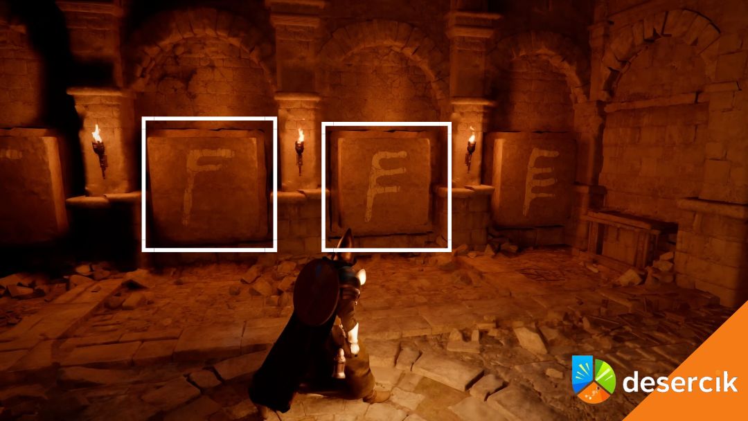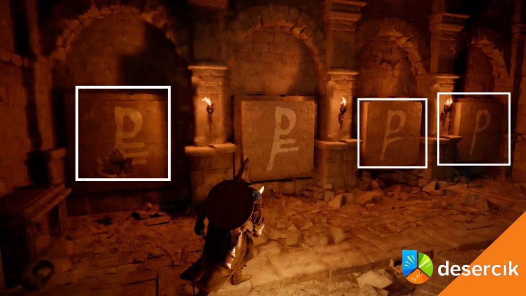 Na wschodniej ścianie aktywujesz dwa środkowe przyciski. Kolejność nie ma znaczenia. Po poprawnym wciśnięciu wszystkich pięciu elementów drzwi się otwierają i możesz iść dalej.
