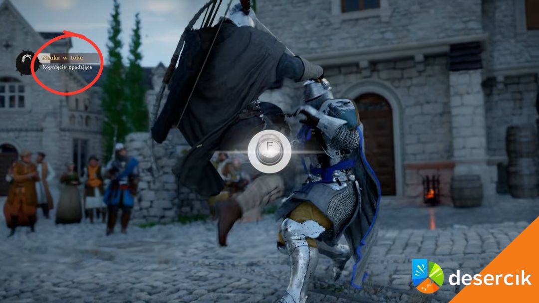 Na początku Matthias rzuci się w Twoją stronę z kopnięciem. Ekran przyciemni się i pojawi się komunikat „Nauka w toku”. To moment, w którym nauczysz się wykonywać kopnięcie opadające – potężne dwunożne kopnięcie, które odpycha przeciwników i łamie ich gardę.