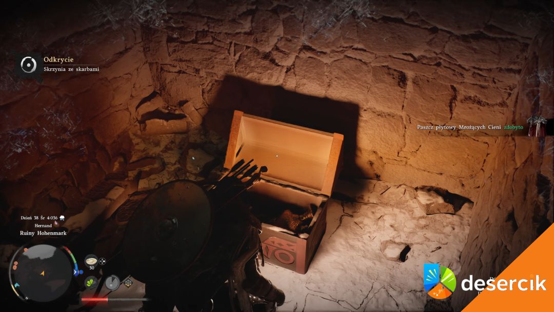 - Zdobycie skrzyni – w tej ukrytej komnacie znajdziesz Skrzynię z Płaszczem Płytowym Mrożących Cieni. Przedmiot wzmacnia ochronę i mobilność postaci, szczególnie przy trudniejszych wyzwaniach w Hernand.