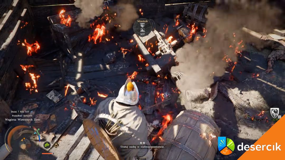 Wejście do domu blokują ogromne płonące belki. Musisz użyć umiejętności, aby je odsunąć. Gra podpowie odpowiednią kombinację przycisków – wykonaj ją szybko, bo czas cały czas ucieka.
