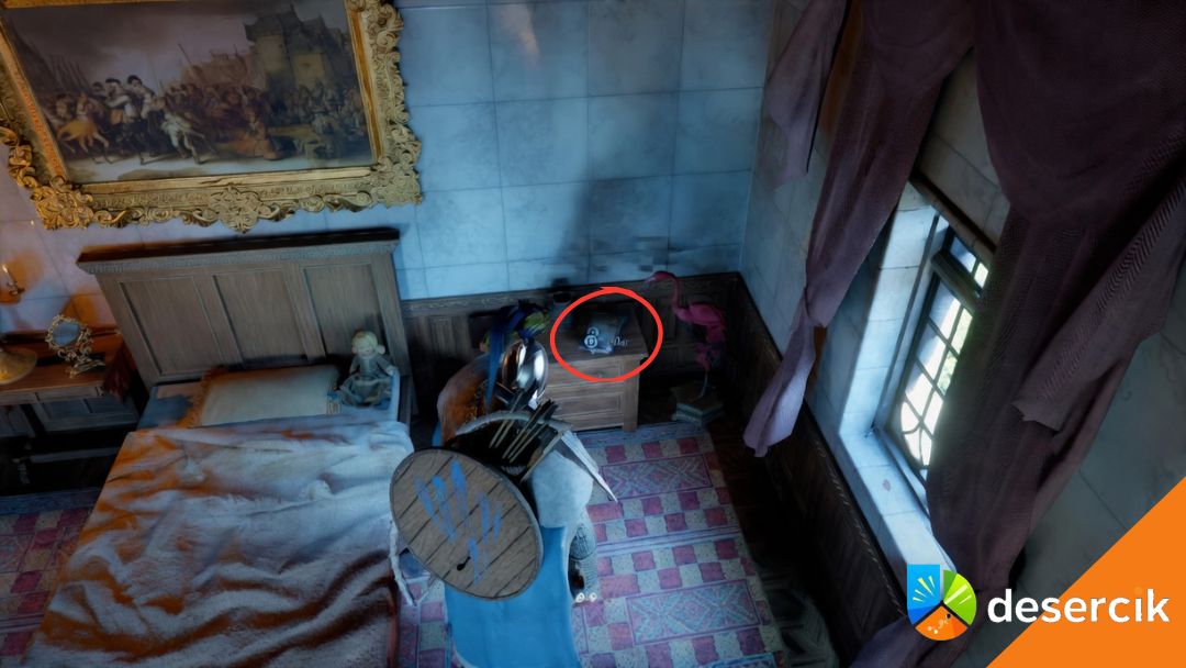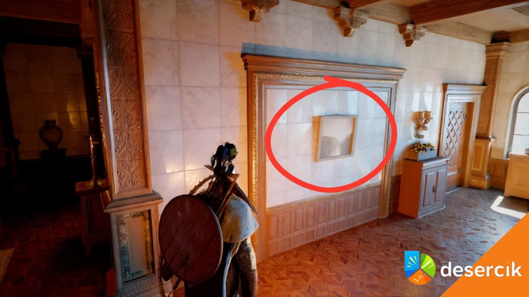 Sekretne pomieszczenie: na piętrze trafisz na korytarz z podejrzanie wyglądającą ścianą. Podejdź do niej – ściana się obróci, odsłaniając ukryty pokój.