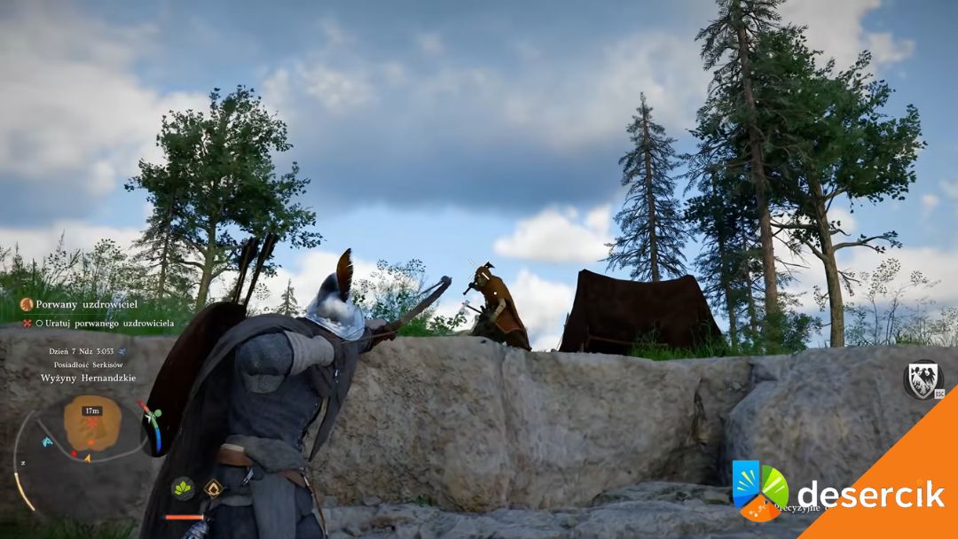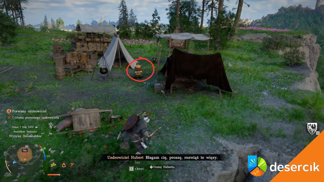Gdy wróg padnie, rozejrzyj się po obozie. Hubert – porwany uzdrowiciel – jest związany i unieruchomiony. Podejdź do niego, namierz postać i użyj interakcji, aby przeciąć więzy.