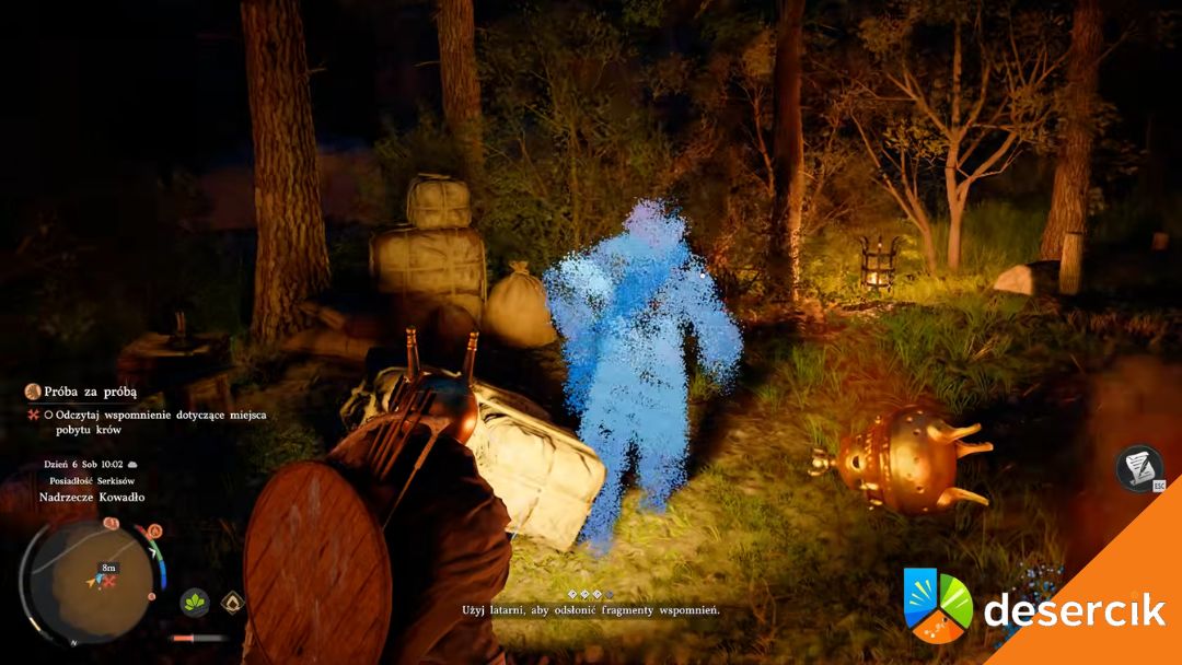 - Użyj latarni w centrum obozu, aby śledzić fragmenty pamięci – niebieskie duchy pokazują, co się wydarzyło z „Zaginioną krową”.