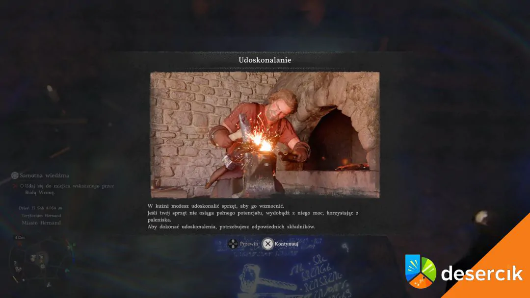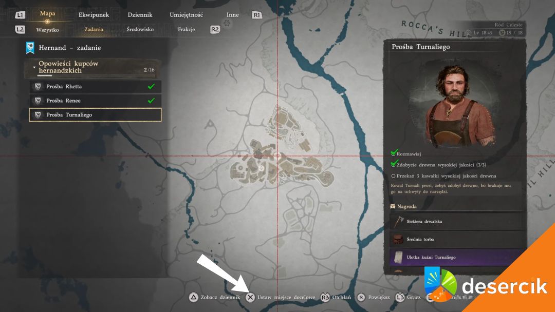 Turnali znajduje się w miasteczku Hernand. Możesz sprawdzić jego dokładną lokalizację na mapie, otwierając Zadania i szukając szarego lub białego herbu. Po najechaniu kursorem zobaczysz szczegóły zadania „Prośba Turnaliego„. Wciśnij Ustaw miejsce docelowe (A na Xbox / X na PS5), aby wyznaczyć drogę do kowala.