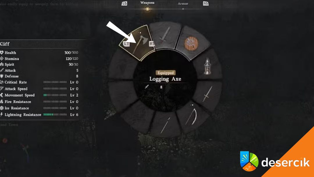 Najpierw upewnij się, że masz wyposażoną siekierę do ścinania drzew. Możesz ją włączyć w ekwipunku lub przytrzymać lewy przycisk D-Pada i wcisnąć LT/RT (L2/R2), aby przełączyć na siekierę.