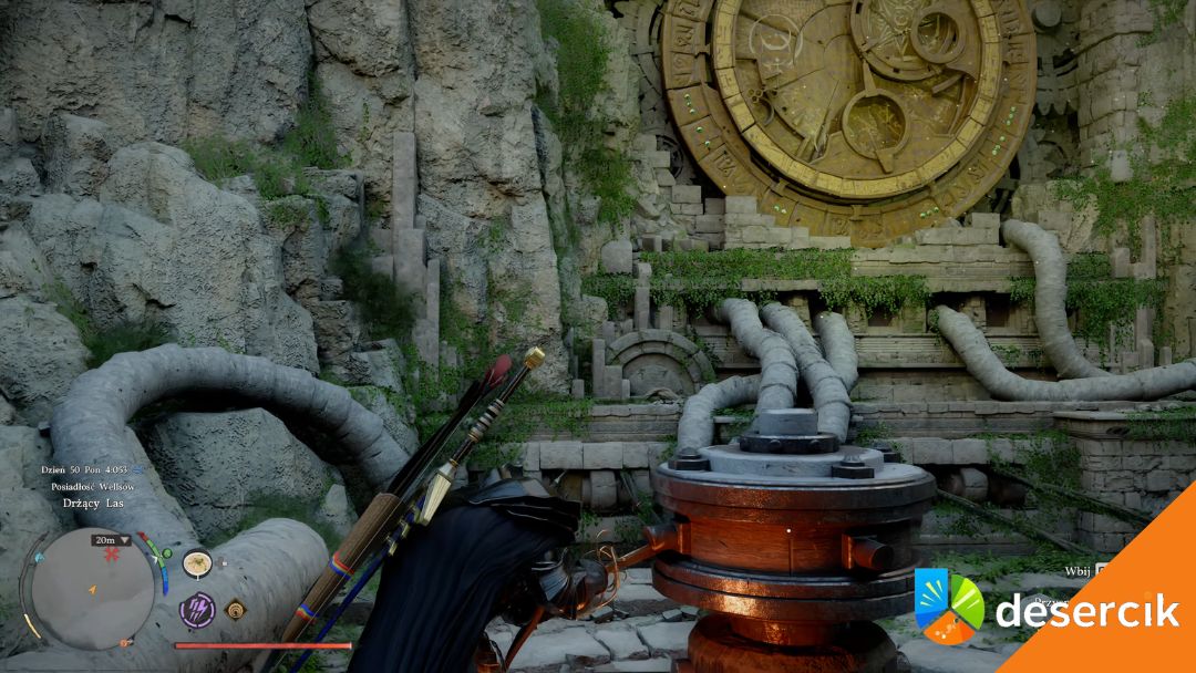 Przed tobą stanie duży złoty dysk i trzy obracające się koła. Koła po prawej i w środku mają uchwyty, które pozwalają je obracać. Koło po lewej nie ma uchwytów i wydaje się niemożliwe do ruszenia, ale jeśli odblokowałeś umiejętność Stab, też możesz je poruszyć.