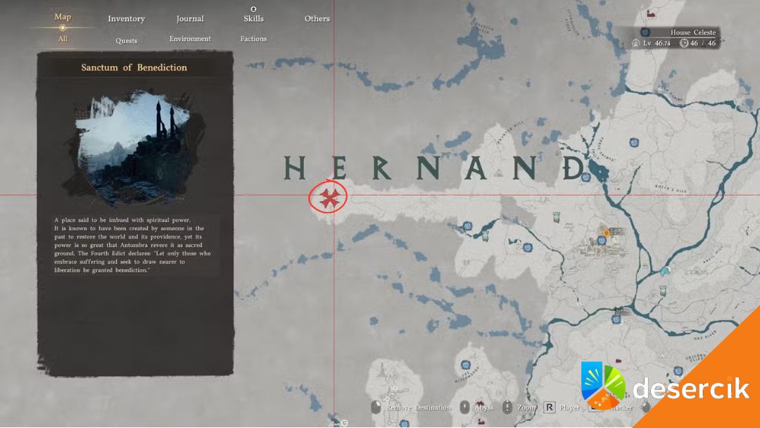 Na mapie Crimson Desert, po pełnym oddaleniu, zobaczysz region Hernand wyróżniony pogrubionymi literami, jako jeden z głównych obszarów gry. Jeśli szukasz Sanktuarium Błogosławieństwa, znajduje się ono pod literą E w Hernand. To prawdopodobnie teren, którego jeszcze nie odwiedzałeś, jeśli chcesz oczyścić sanktuaria zaraz po otrzymaniu zadania.