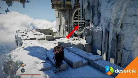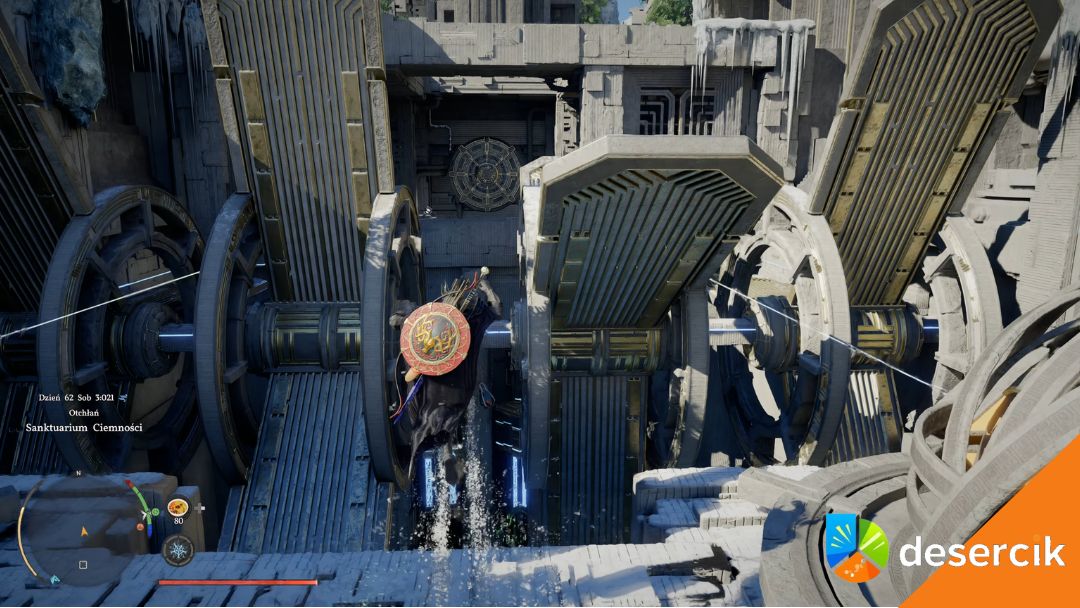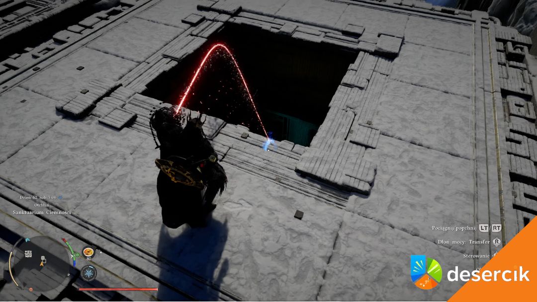 Wskocz na górę i przez wspomniany wcześniej otwór wyjmij baterię. Przesuń ją na prawo i zeskocz do miejsca, w którym musisz ją umieścić. Przesuń baterię na odpowiednie miejsce i dobij Dłonią Mocy.
