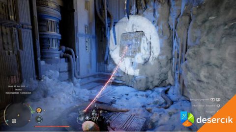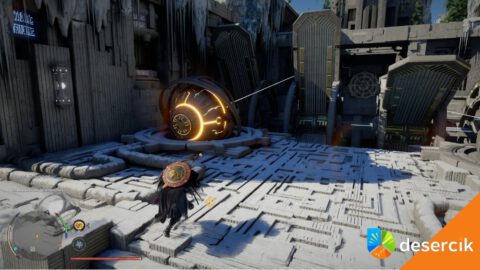 Zaznaczone drzwi otworzycie za pomocą Dłoni Mocy. Baterię przy pomocy Mocy Aksjomatu przeciągnij na górę jak najbliżej dziury w suficie.
