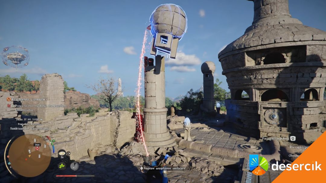 Ustaw kopułę na szczycie uszkodzonego pylona na zewnątrz. Jeśli zrobisz to poprawnie, wokół niej pojawią się wirujące zielone liście. To wizualny sygnał, że ustawienie się powiodło.