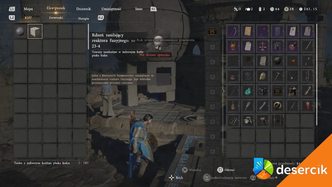 Wróć do naprawionego pylona. Otwórz ekwipunek, wybierz Kocioł Kuku i wybierz opcję zbadaj. Z poziomu kotła Kuku wyrzuć element oznaczony jako „rdzeń”. Wyrzucenie go z wnętrza naczynia sprawi, że pojawi się w świecie gry jako fizyczny obiekt, z którym możesz bezpośrednio wejść w interakcję.