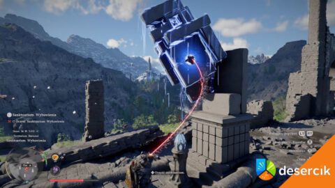 Następnie kierujesz się wyżej, na ruiny przypominające konstrukcję zamkową. Tam trafisz na fragment popękanej podłogi. Nie kombinuj – trzeba po niej przejść i pozwolić, żeby się zawaliła. To jedyna droga dalej. Na dole znajdziesz drugi rdzeń: Rdzeń fuzyjny reaktora: IV. Znowu używasz Mocy Aksjomatu i chowasz go do Kotła Kuku.