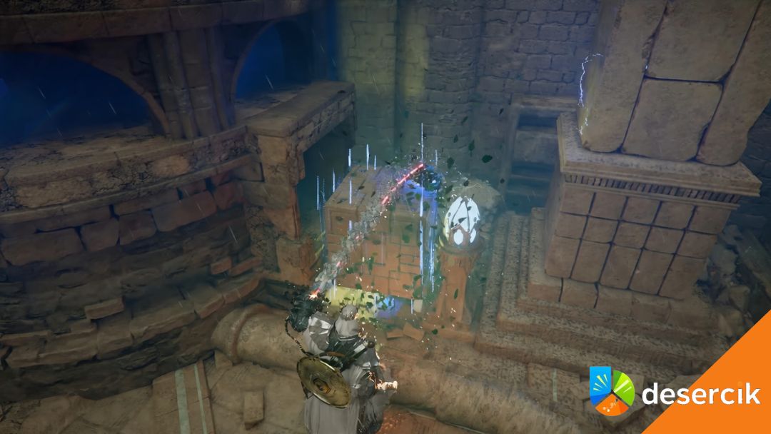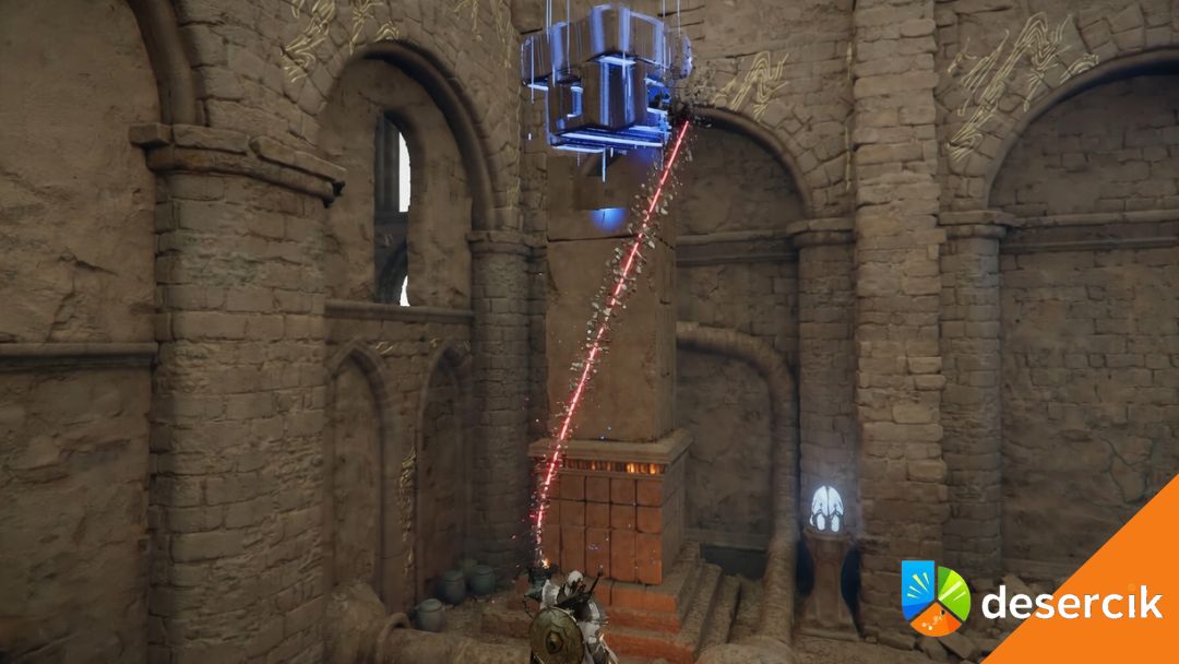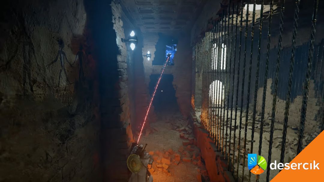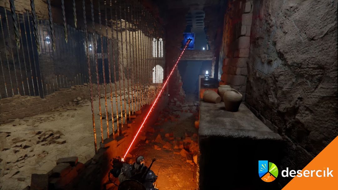 Najwięcej osób blokuje się tutaj nie przez walkę, tylko przez szukanie elementów. Kluczowe jest rozglądanie się po ścianach i dziurach w kratach – gra nie prowadzi cię za rękę. Cała zagadka sprowadza się do jednego schematu: znajdź element → ustaw go w odpowiednim miejscu → aktywuj mechanizm.