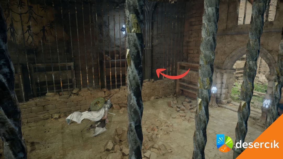 Po chwili trafisz na kraty – po lewej stronie znajdziesz dziurę, przez którą można się przecisnąć. W środku spójrz w prawo. W ścianie są otwory, a w jednym z nich (tym wyżej) znajdziesz fragment filaru.