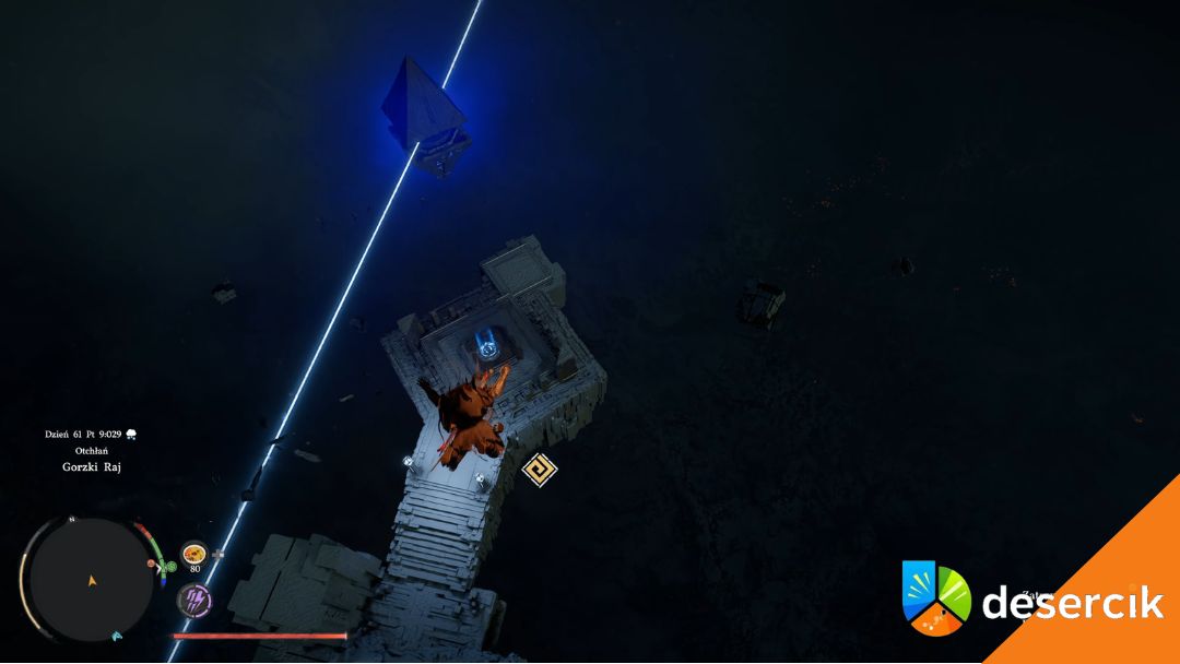 Po przejściu na drugą stronę skręcasz w lewo i kierujesz się na zachód. Mijasz zapaloną latarnię i trafiasz do przejścia z niebieskim filarem i dużym kwadratowym panelem. Wyciągasz filar ze ściany i zostawiasz go – będzie potrzebny później.