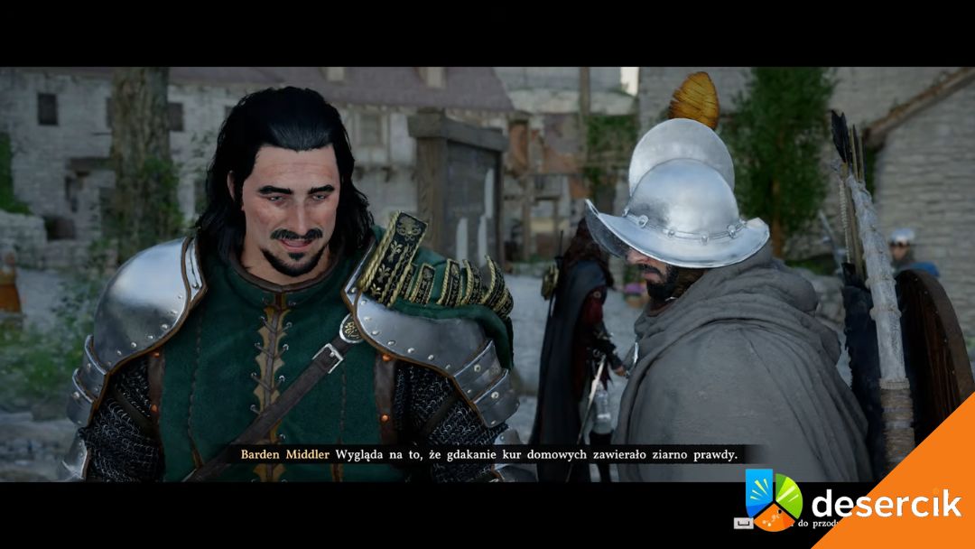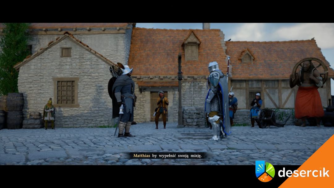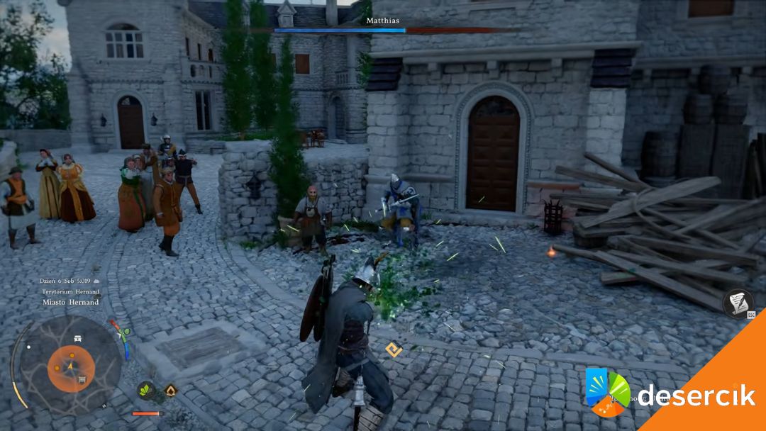 Na placu znajdziesz niewielkie zgromadzenie otaczające siedzącego rycerza. To Matthias – postać, z którą musisz porozmawiać. Namierz go i rozpocznij dialog.
