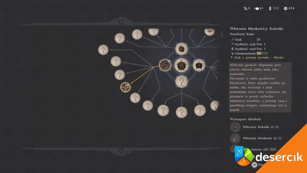 Po tym odblokujesz możliwość craftowania włóczni Kuku w warsztacie Kilnden. Drugi etap to Sanktuarium Powściągliwości w Delesyii. Po jego oczyszczeniu dostajesz już bezpośrednio schemat na Włócznię Błyskawicy Kukułki.