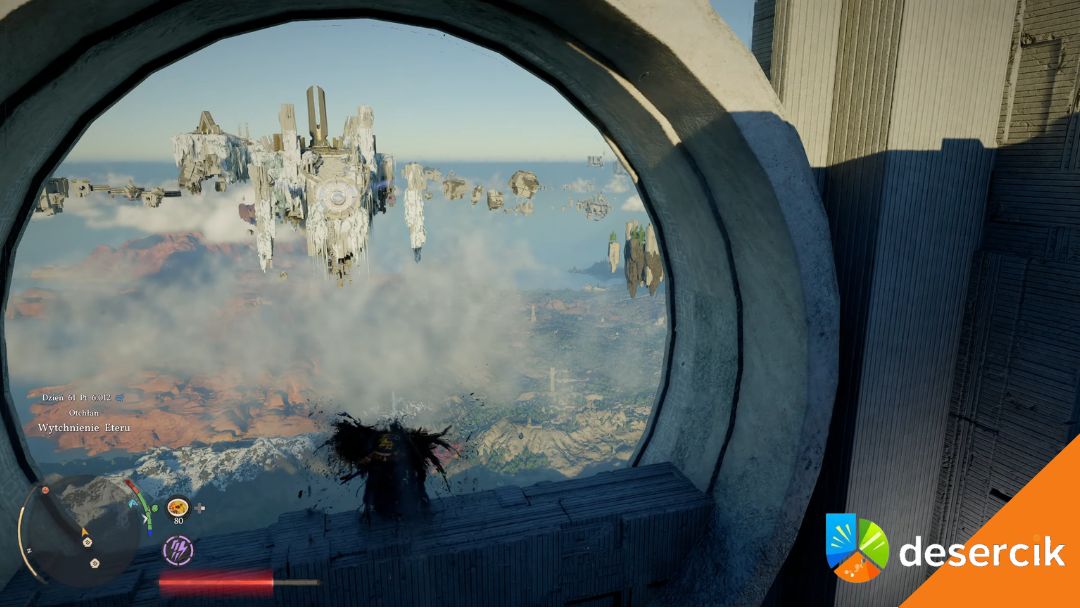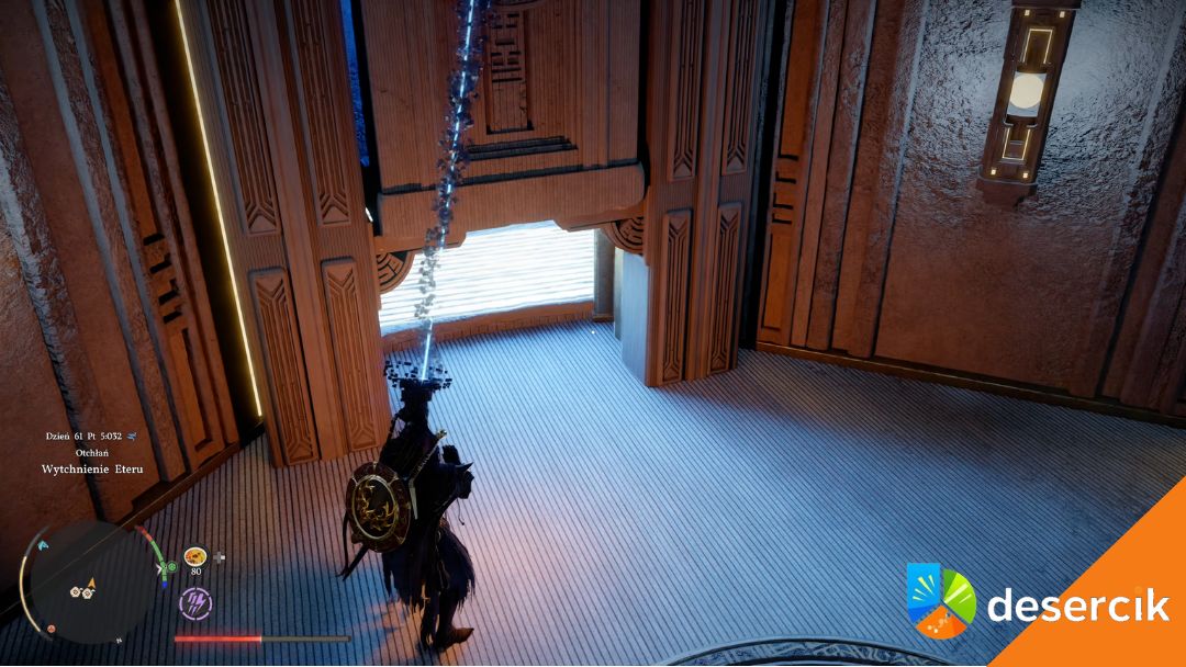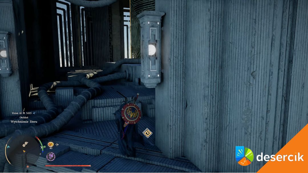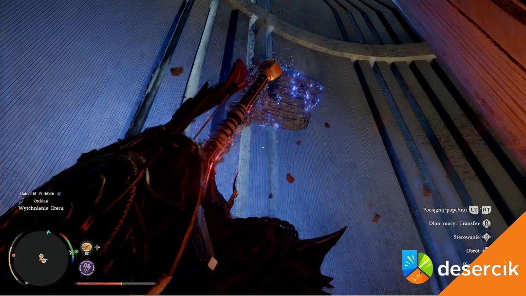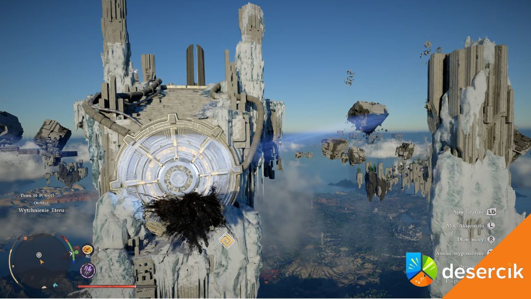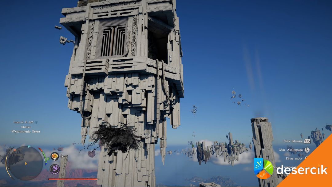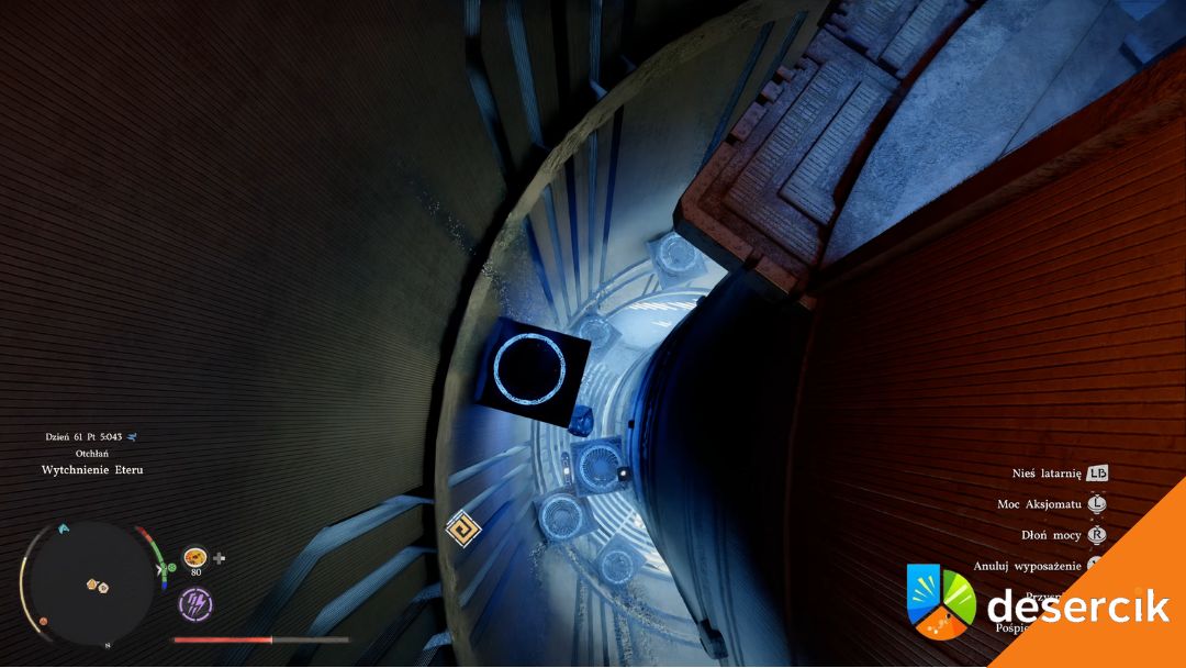 Kiedy jesteś już w powietrzu, wykorzystujesz Moc Aksjomatu, żeby przeskoczyć na kolejną platformę. Dalej wszystko idzie w górę, aż trafisz na charakterystyczny niebieski rdzeń, czyli Rdzeń Mocy – Brama Upadku. Trzeba go zapieczętować, bo bez tego nie ruszysz dalej.